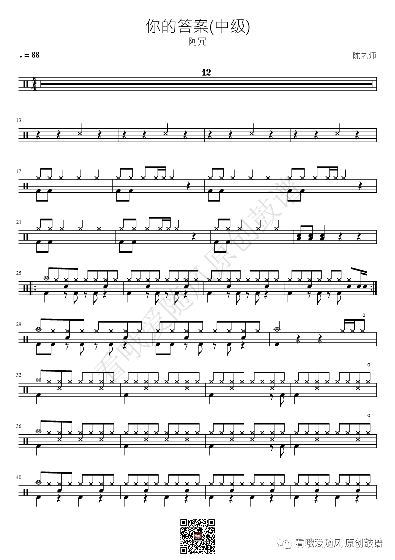 阿冗《你的答案》架子鼓谱中级, 看哦爱随风编配出品,共有2张高清图谱,由打鼓谱上传并分享。NO.398 你的答案(中级) 阿冗 鼓谱