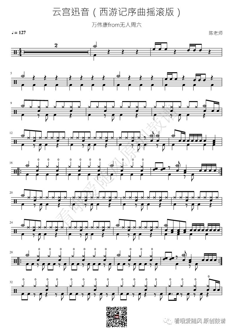 西游记序曲《云宫迅音》架子鼓谱摇滚版, 看哦爱随风编配出品,共有2张高清图谱,由打鼓谱上传并分享。NO.422 云宫迅音 西游记序曲摇滚版 鼓谱