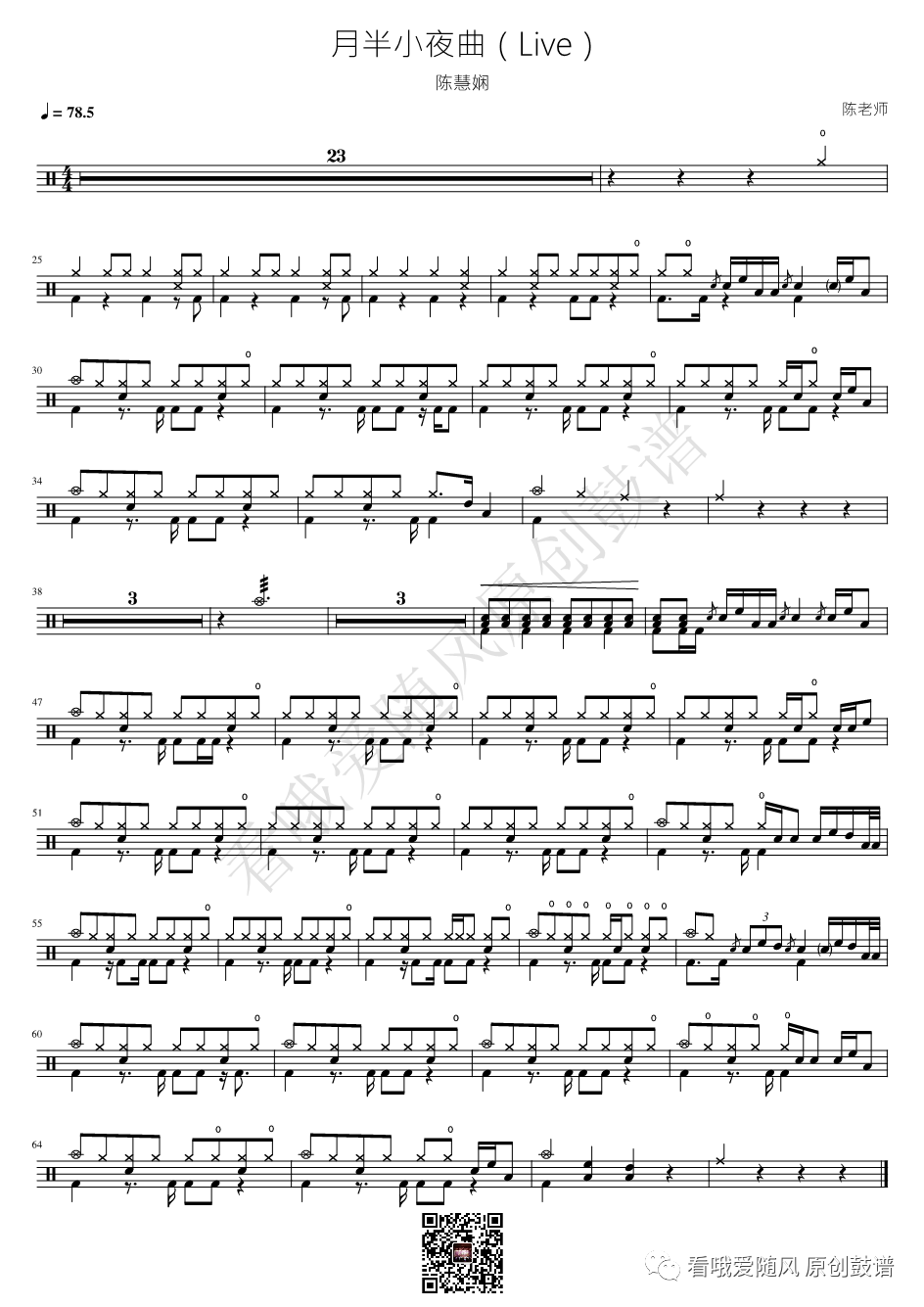 陈慧娴《月半小夜曲》架子鼓谱Live, 看哦爱随风编配出品,共有1张高清图谱,由打鼓谱上传并分享。NO.441 月半小夜曲(Live)陈慧娴 鼓谱