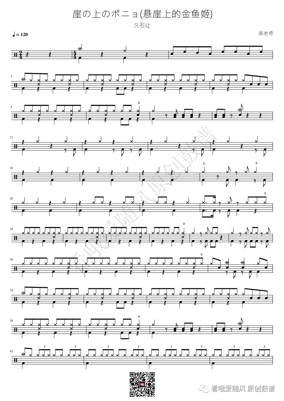 久石让《悬崖上的金鱼姬》架子鼓谱, 看哦爱随风编配出品,共有2张高清图谱,由打鼓谱上传并分享。NO.446 悬崖上的金鱼姬 久石让 鼓谱