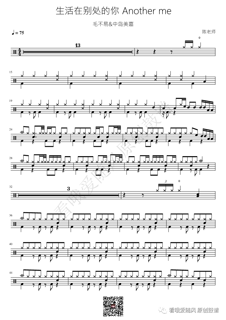 毛不易/中岛美嘉《生活在别处的你 Another me》架子鼓谱, 看哦爱随风编配出品,共有2张高清图谱,由打鼓谱上传并分享。NO.456 生活在别处的你 Another me【毛不易&中岛美嘉】鼓谱
