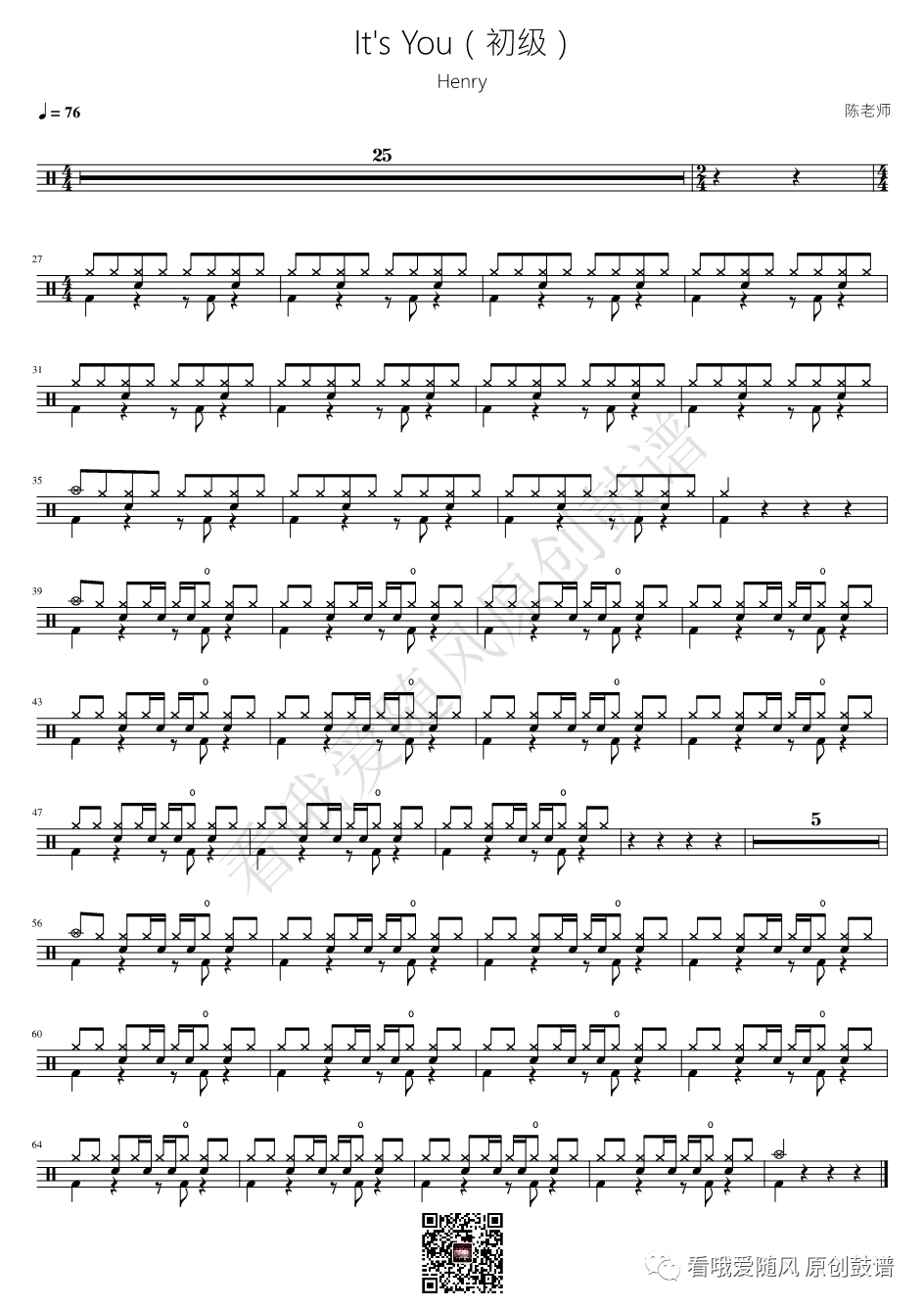Henry《It's You》架子鼓谱初级, 看哦爱随风编配出品,共有1张高清图谱,由打鼓谱上传并分享。NO.473 It's You(初级)Henry 鼓谱