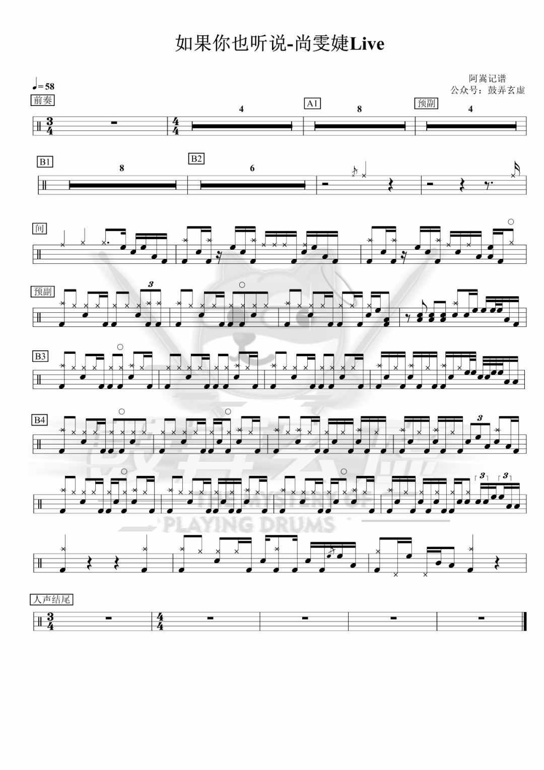 尚雯婕《如果你也听说》架子鼓谱live,鼓弄玄虚编配出品,共有1张高清图谱,由打鼓谱上传并分享。鼓谱:《如果你也听说》-尚雯婕(live)