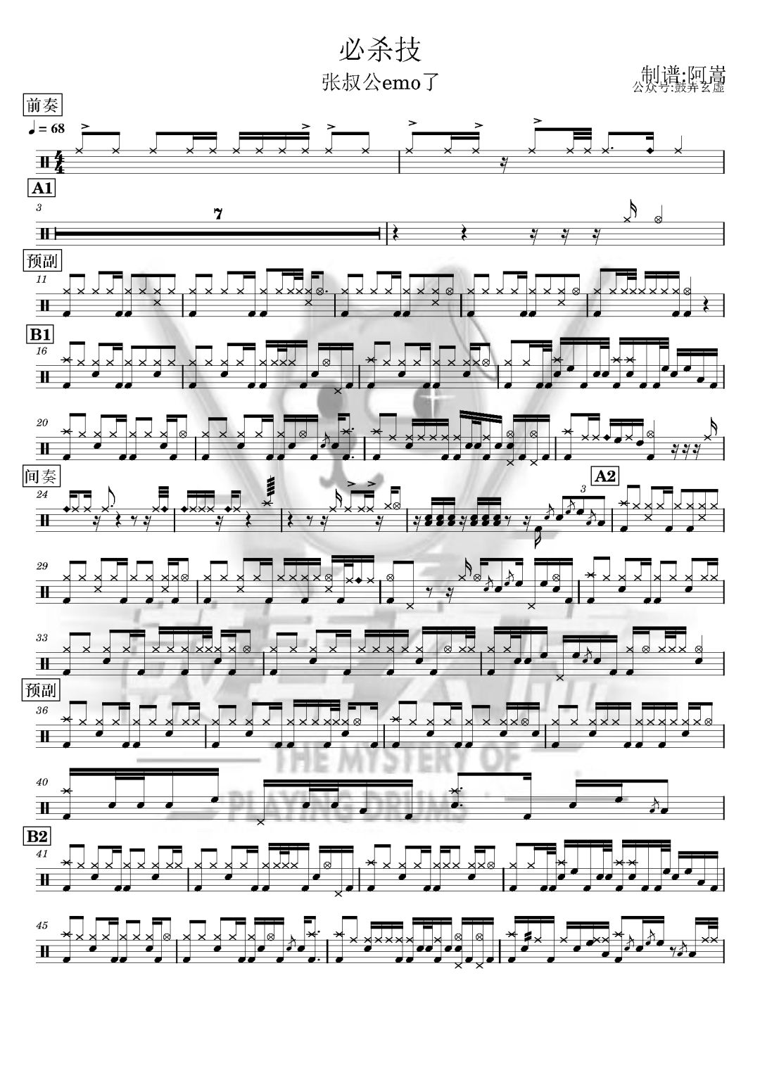 张叔公emo了《必杀技》鼓谱 - 架子鼓谱