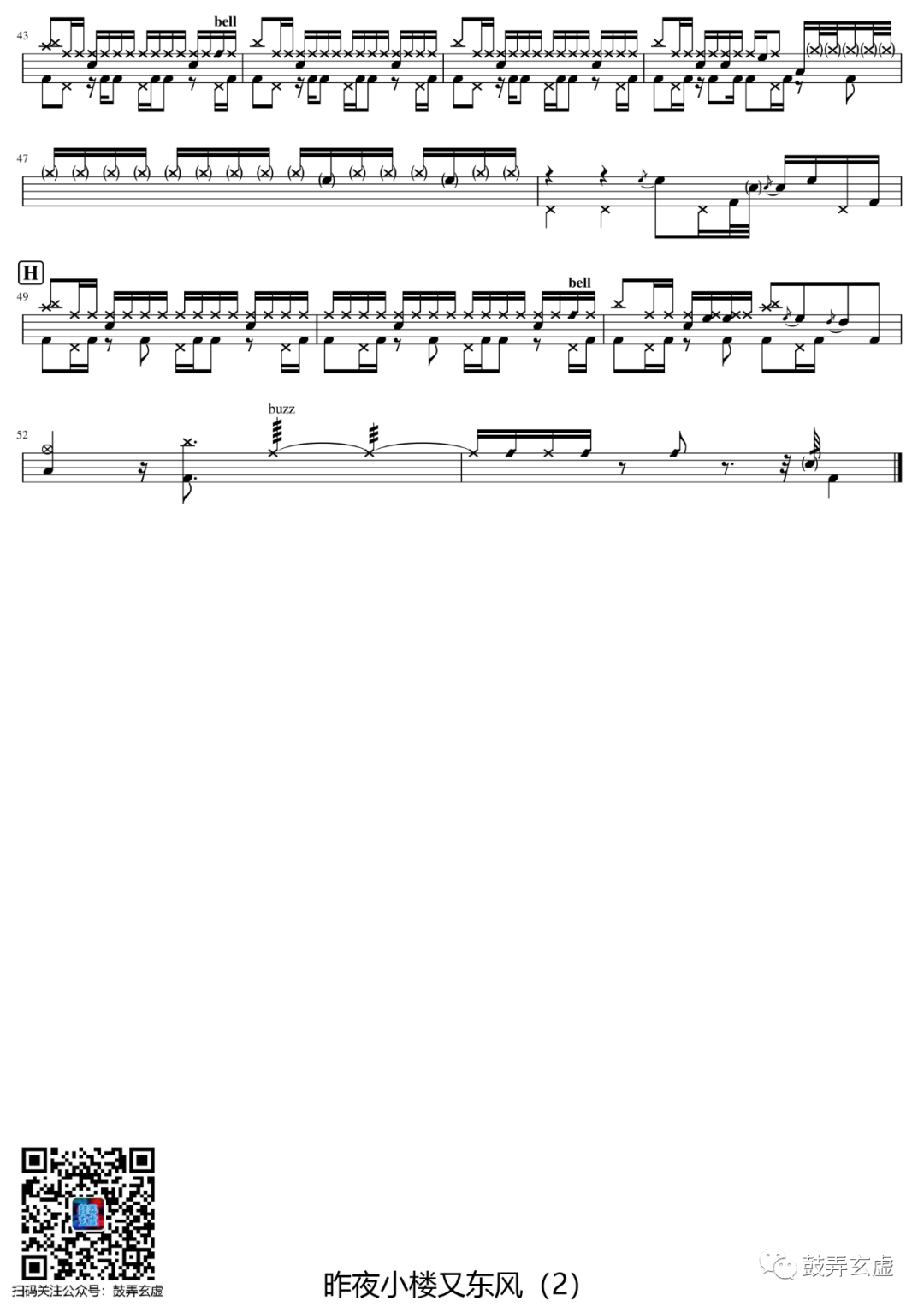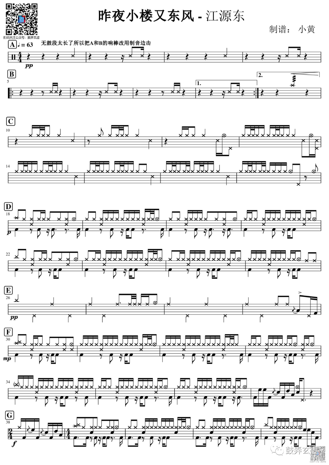 江源东《昨夜小楼又东风》架子鼓谱,鼓弄玄虚编配出品,共有2张高清图谱,由打鼓谱上传并分享。鼓谱:《昨夜小楼又东风》-江源东(原唱费玉清)