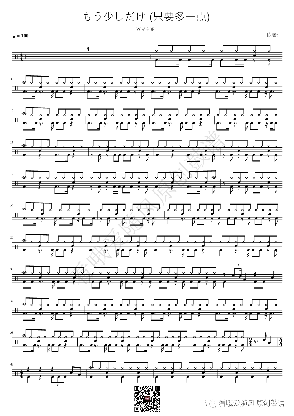 YOASOBI《もう少しだけ (只要多一点)》架子鼓谱, 看哦爱随风编配出品,共有2张高清图谱,由打鼓谱上传并分享。NO.634 もう少しだけ (只要多一点)【YOASOBI】鼓谱