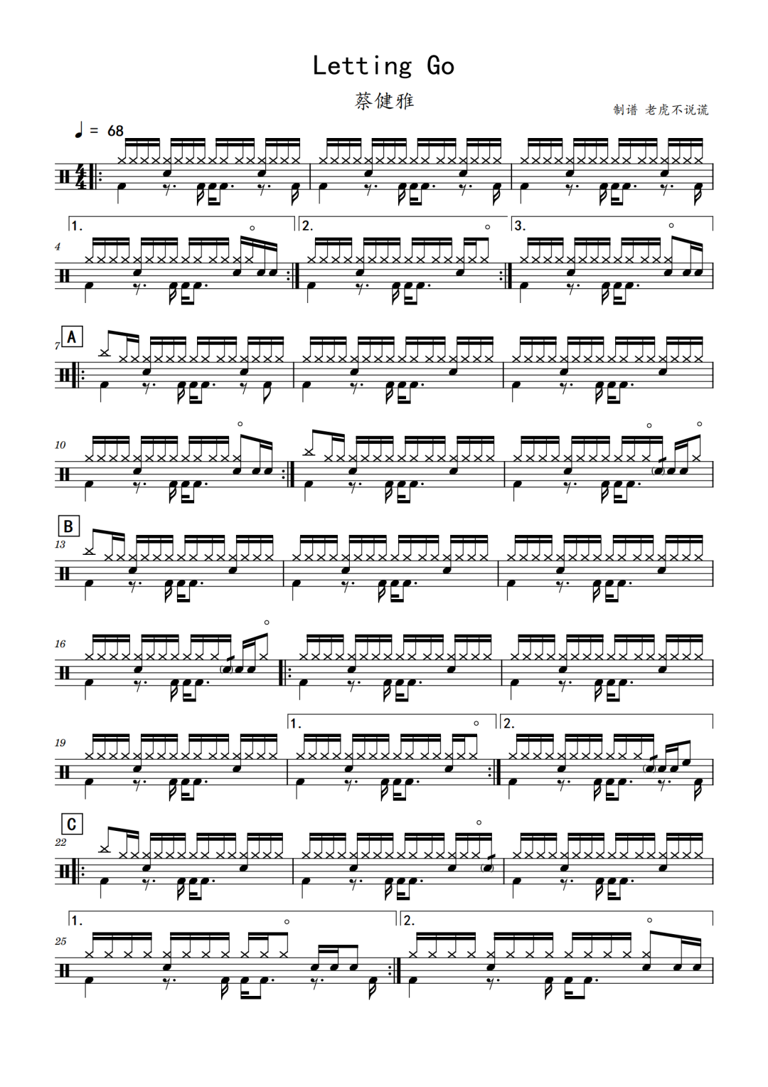 蔡健雅《Letting Go》架子鼓谱,小虎鼓谱编配出品,共有2张高清图谱,由打鼓谱上传并分享。蔡健雅 - Letting Go