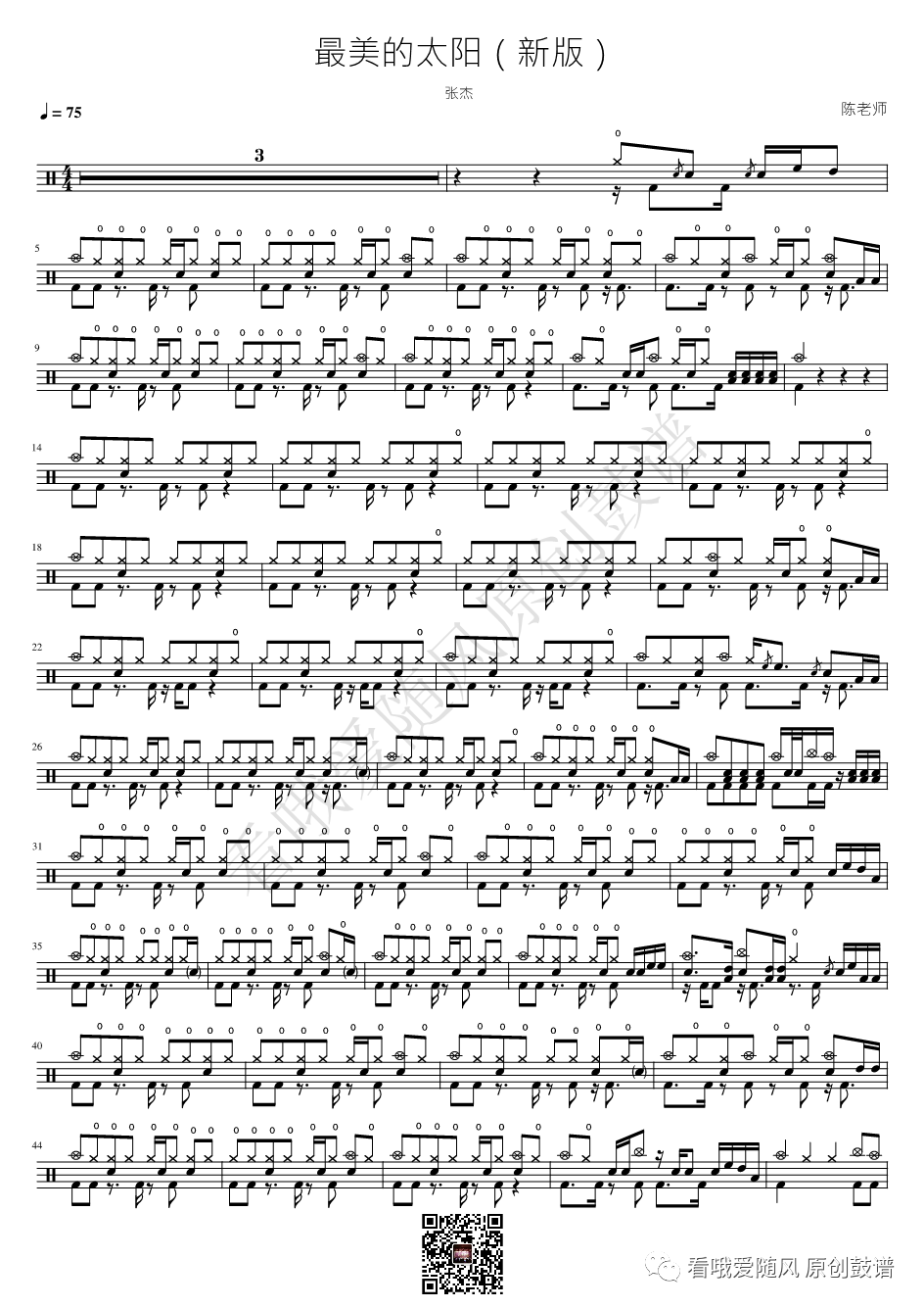 张杰《最美的太阳》架子鼓谱新版, 看哦爱随风编配出品,共有2张高清图谱,由打鼓谱上传并分享。NO.711 最美的太阳(新版)张杰 鼓谱