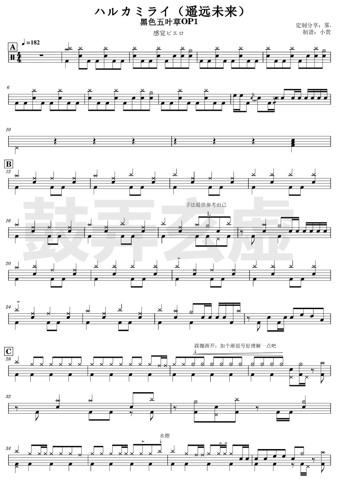 黑色五叶草OP1《ハルカミライ》架子鼓谱,鼓弄玄虚编配出品,共有3张高清图谱,由打鼓谱上传并分享。鼓谱:黑色五叶草OP1《ハルカミライ》(遥远未来)-感覚ピエロ
