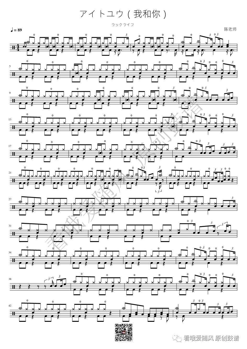 ラックライフ《アイトユウ(我和你)》架子鼓谱, 看哦爱随风编配出品,共有2张高清图谱,由打鼓谱上传并分享。NO.921 アイトユウ(我和你)ラックライフ 鼓谱