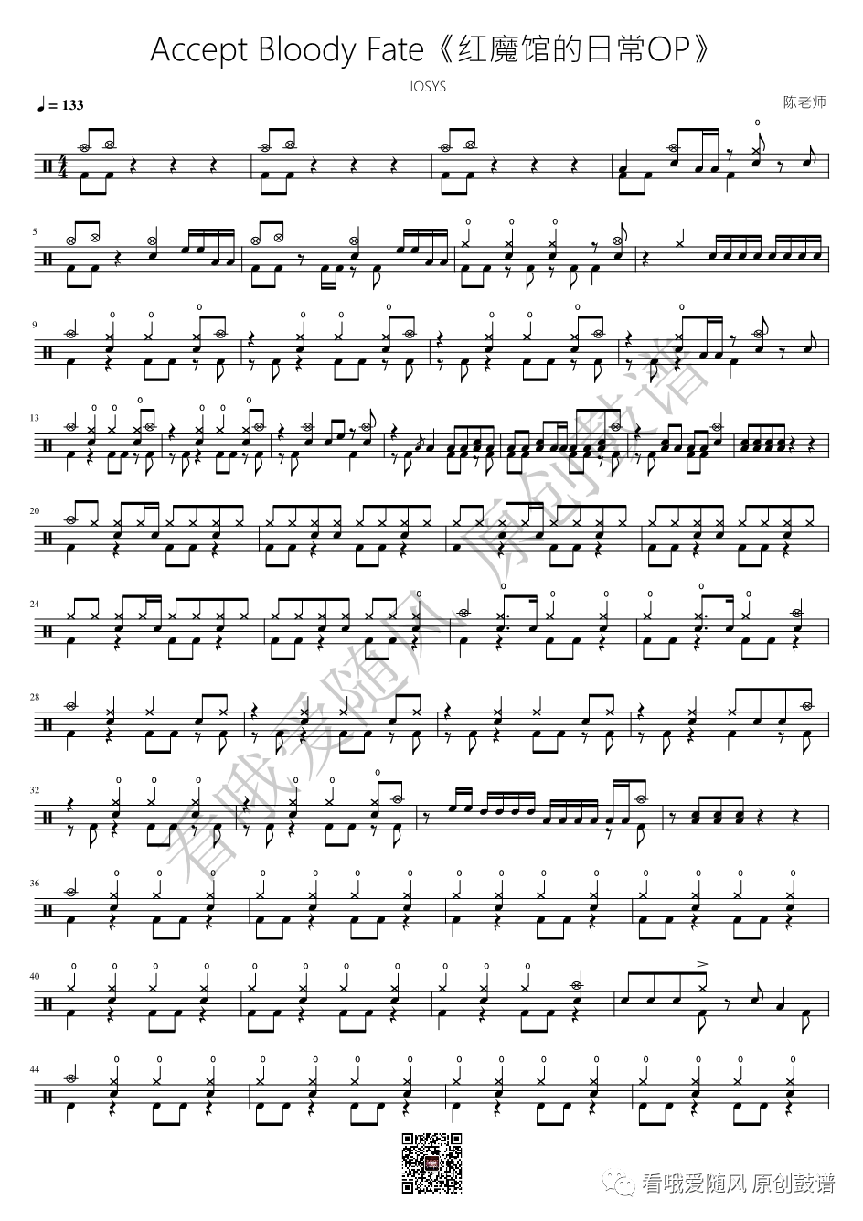 红魔馆的日常OP《Accept Bloody Fate》架子鼓谱, 看哦爱随风编配出品,共有1张高清图谱,由打鼓谱上传并分享。NO.958 Accept Bloody Fate【红魔馆的日常OP】鼓谱