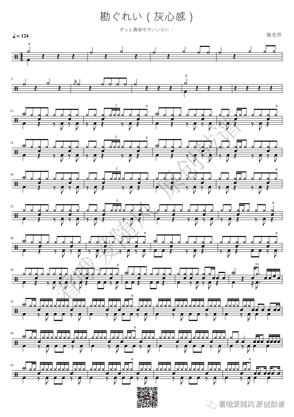 真夜中《勘ぐれい(灰心感)》架子鼓谱, 看哦爱随风编配出品,共有1张高清图谱,由打鼓谱上传并分享。NO.976 勘ぐれい(灰心感)【真夜中】鼓谱