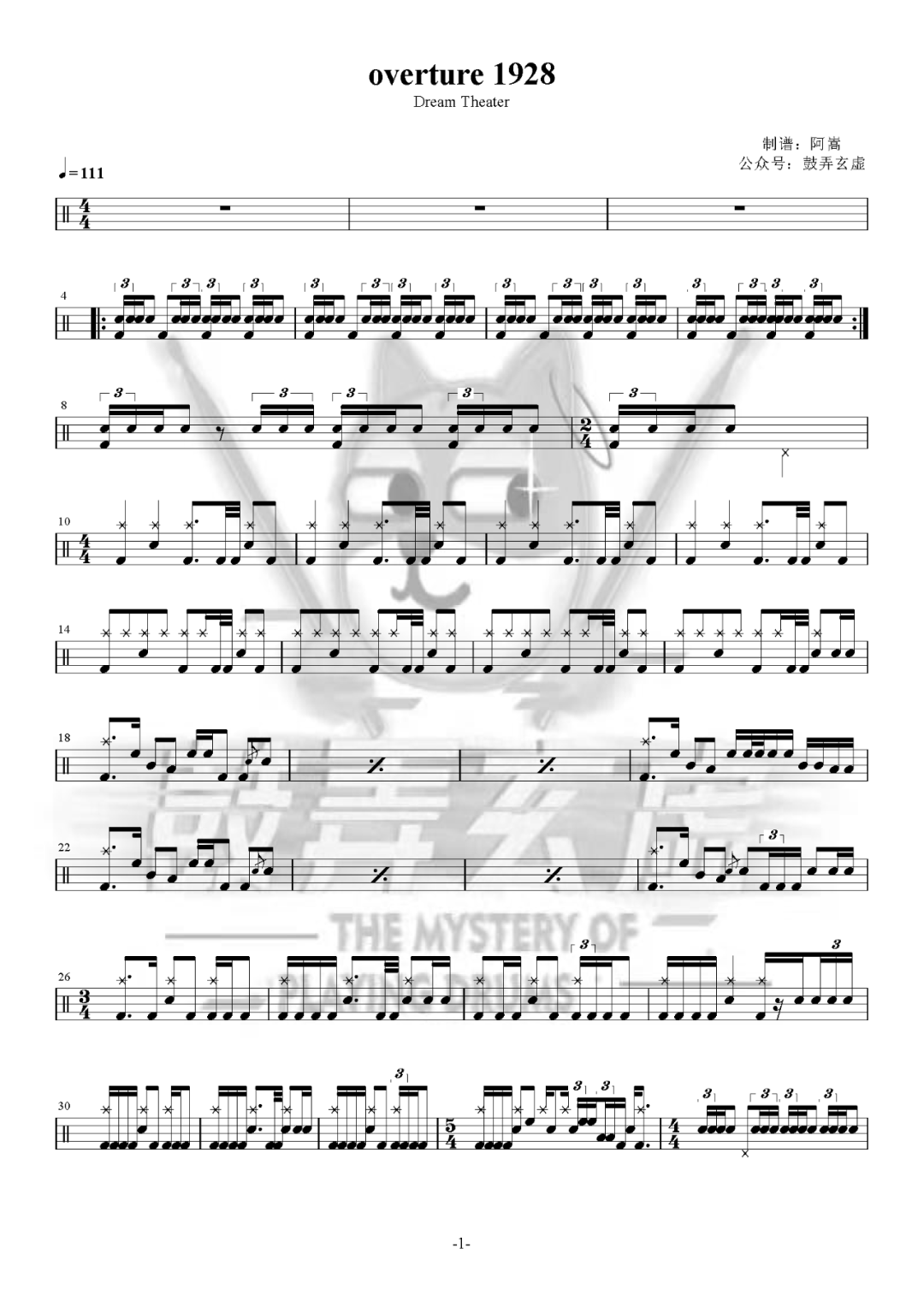 梦剧院《Overture1928》架子鼓谱,鼓弄玄虚编配出品,共有3张高清图谱,由打鼓谱上传并分享。鼓谱:《Overture1928》-梦剧院