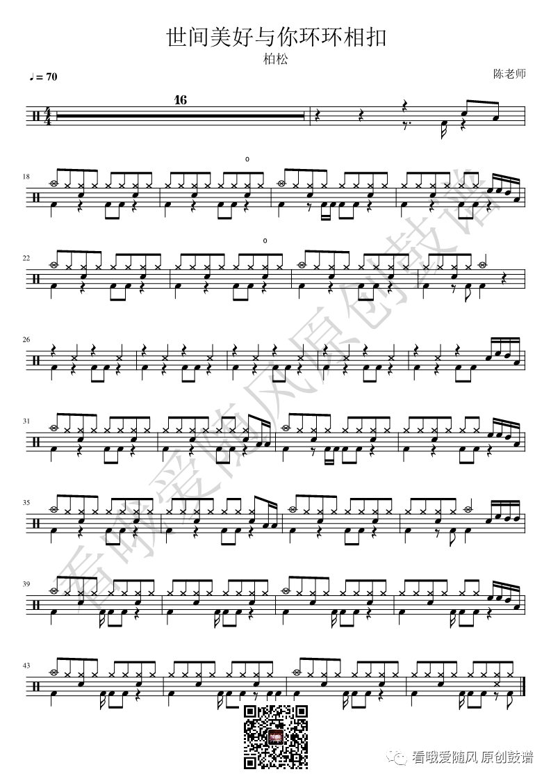 松柏《世间美好与你环环相扣》架子鼓谱, 看哦爱随风编配出品,共有1张高清图谱,由打鼓谱上传并分享。NO.188 世间美好与你环环相扣 松柏 鼓谱
