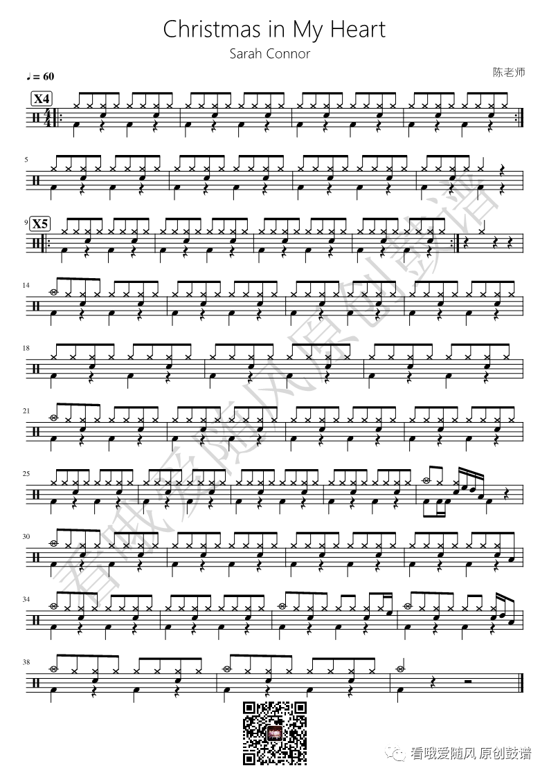 《Christmas in My Heart-Sarah Connor》架子鼓谱, 看哦爱随风编配出品,共有1张高清图谱,由打鼓谱上传并分享。NO.227 Christmas in My Heart-Sarah Connor 鼓谱