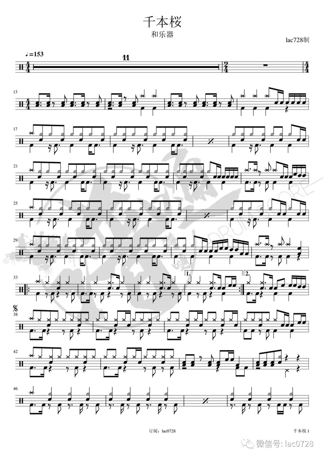 ONEOKROCK《IWasKing》架子鼓谱,看哦爱随风编配出品,共有2张高清图谱,由打鼓谱上传并分享。