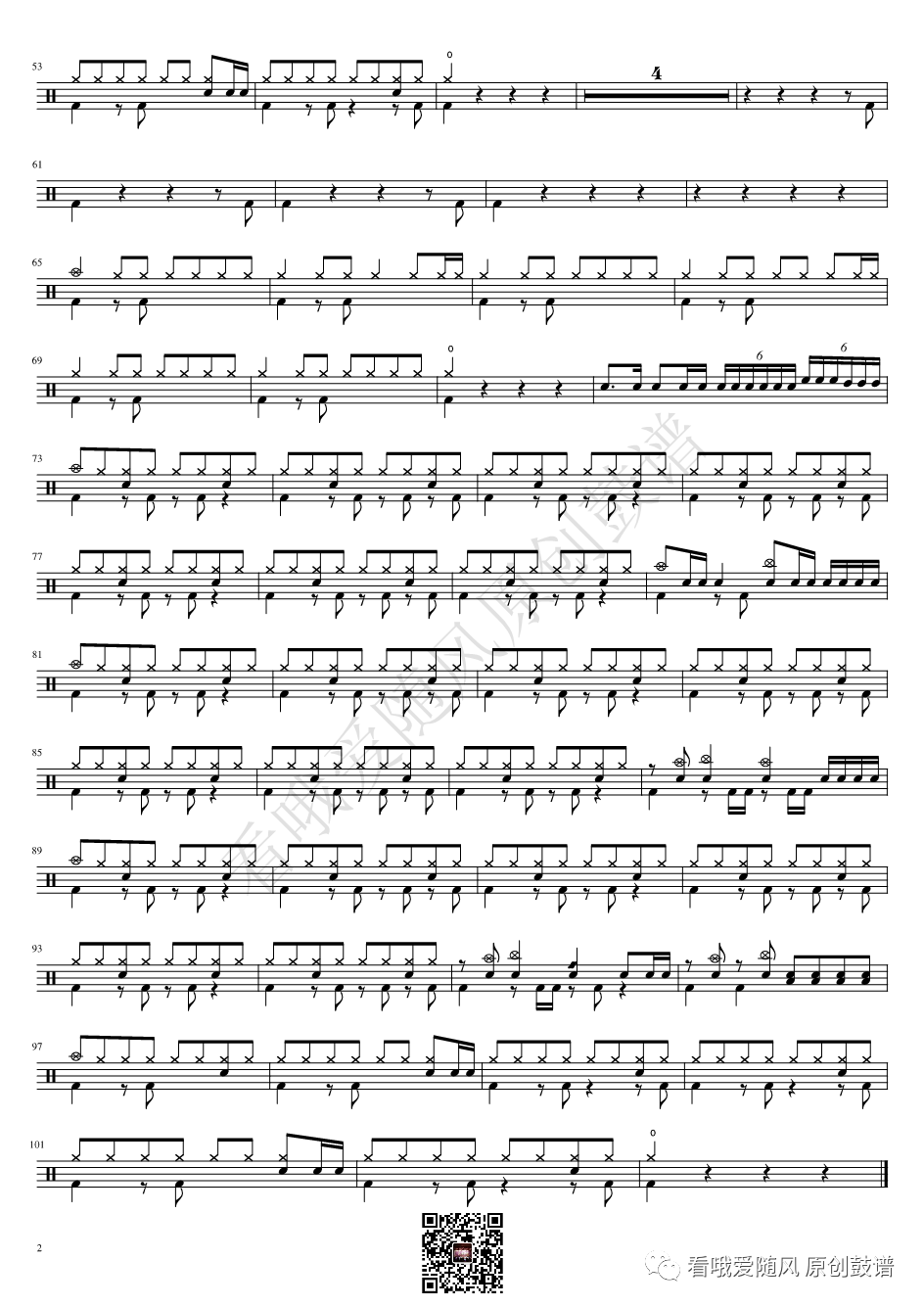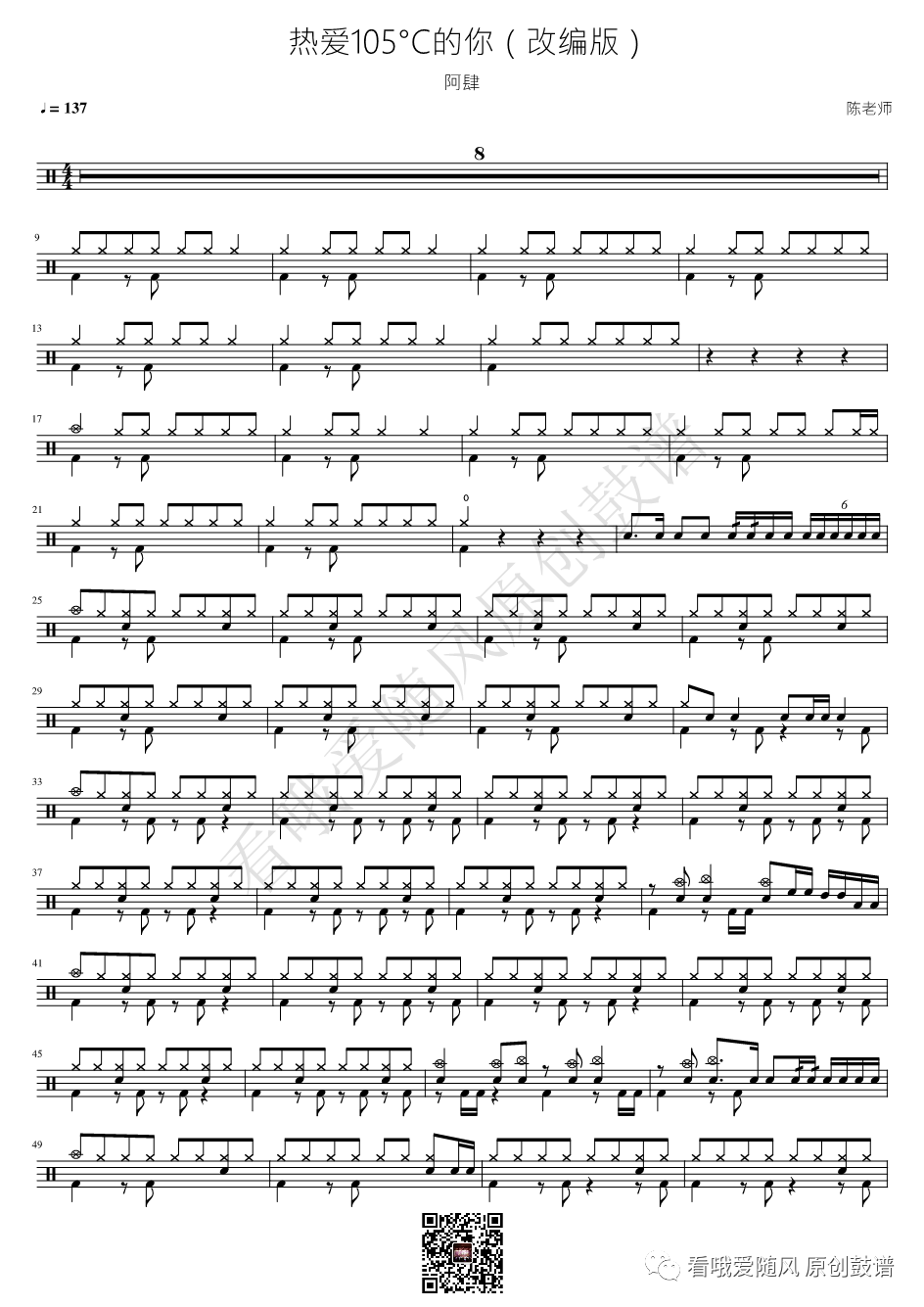 阿肆《热爱105°C的你》架子鼓谱改编版, 看哦爱随风编配出品,共有2张高清图谱,由打鼓谱上传并分享。NO.419 热爱105°C的你(改编版)阿肆 鼓谱
