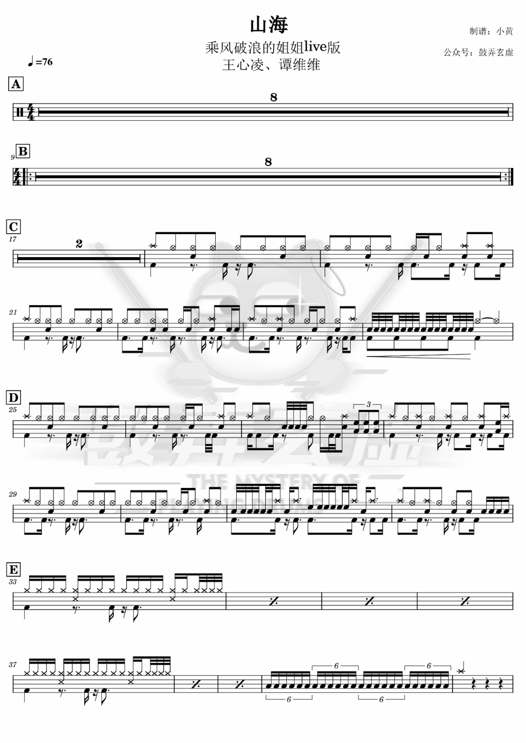 王心凌/谭维维《山海》架子鼓谱乘风破浪的姐姐live版,鼓弄玄虚编配出品,共有2张高清图谱,由打鼓谱上传并分享。鼓谱:《山海》-王心凌、谭维维(乘风破浪的姐姐live版)